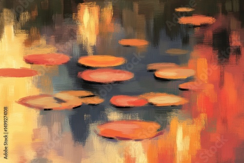 Abstrakcyjny pejzaż wodny z liśćmi lilii wodnych