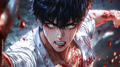 Młody mężczyzna w zaciętej walce, anime, styl mangi