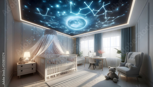 A nursery with ceiling projections of constellations reacting to baby breathing, Ai created image