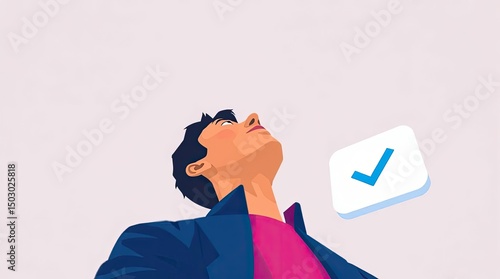 Illustration of a man looking up at a checkmark icon against a pale background color gradient