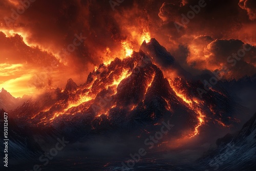 Dark fantasy landscape featuring an erupting mountain spewing flames under a dramatic fiery sky at dusk