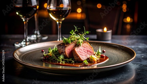 Elegant fine dining plate with gourmet meat, microgreens, sauce artfully plated, dark moody background, top-tier cuisine. Restaurant, cafe