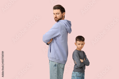 Young father and his little son with crossed arms not looking at each other after squabbling on pink background