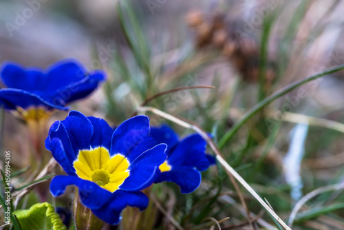 Jasnoniebieskie kwiaty pierwiosnka (Primula vulgaris) z żywymi żółtymi środkami można zobaczyć kwitnące wśród zielonej trawy. Delikatne płatki uderzają na stonowanym, ziemistym tle.