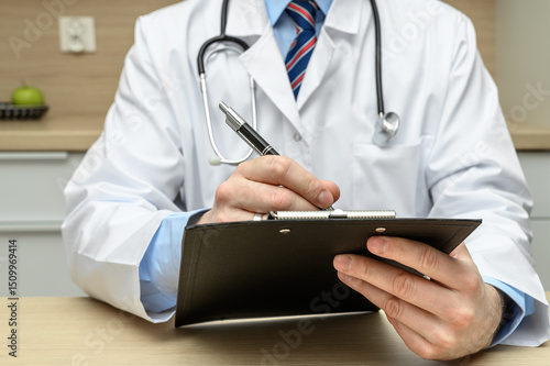 Lekarz siedzi za biurkiem i coś pisze, wystawiać skierowanie na badanie