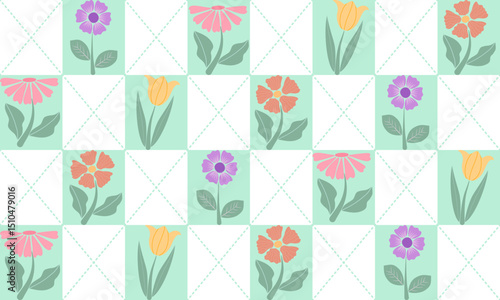 a tartan pattern green pastel color with pastel flowers , design for fabric or various pattern printing works.