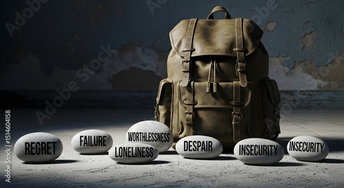 Burden of the Emotional Baggage: A symbolic scene depicts a worn backpack accompanied by stones labeled with emotionally heavy words, representing life's burdens.