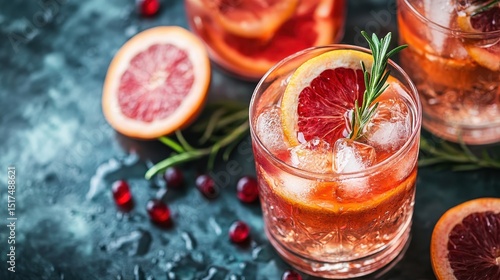 Refreshing blood orange cocktail with ice and rosemary garnish on textured background