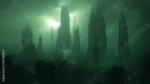 Eerie green cityscape shrouded in fog, creating a mysterious and dystopian atmosphere