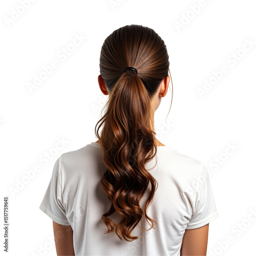 Long wavy brown hair styled in a ponytail viewed from the back isolated on a transparent background showcasing its texture and shine