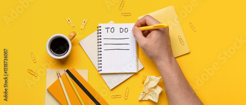 Male hand with to-do list, notebooks, cup of coffee and stationery on yellow background