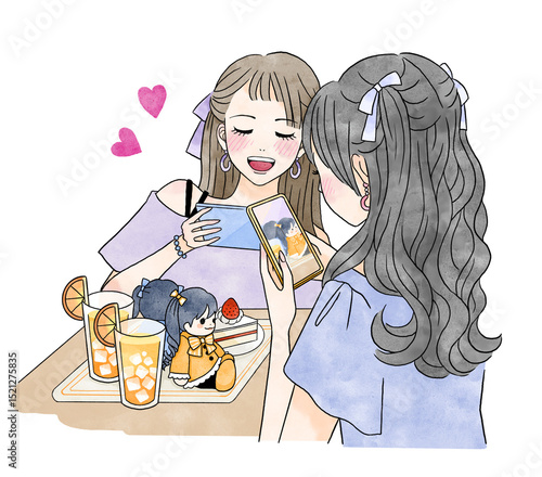 カフェで推しぬいの写真を撮る推し活をする女の子のイラスト