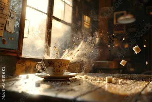 zatrzymany czas, kawiarnia, kawa, ruch zatrzymany, para, okruchy, dramatyczne światło, glibatree, styl kinematograficzny, cukier, codzienność, surrealizm, detale, wnętrze, cisza, zawieszenie, fotoreal