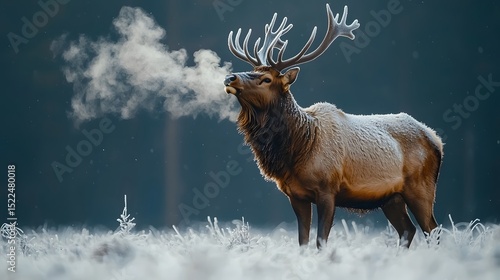 Majestic elk standing in a frost covered meadow steam rising from its nostrils