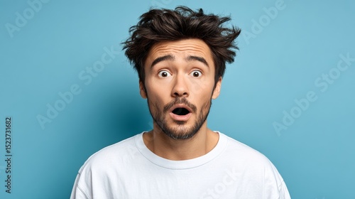Young man with surprised expression and tousled hair, wearing a casual white t-shirt, against a vibrant blue background, capturing a moment of astonishment and emotion in a playful manner