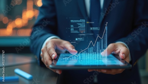 Investor using tablet analyzes financial data chart showing revenue growth. Investment strategy, high return mutual funds, increasing profits in market. Business finance, equity income, savings,