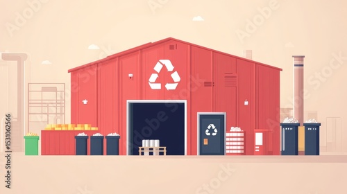 A red recycling facility with bins, pallets, and a smokestack, highlighting waste management and environmental sustainability.