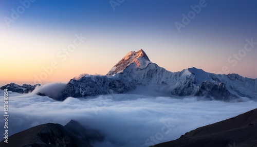 majestic mountain peak piercing clouds at dawn a breathtaking vista of a snow capped mountain rising above a sea of clouds