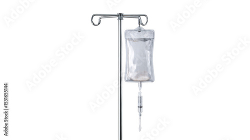 Iv drip filled with saline solution, suspended on a metal pole, isolated against a transparent background, prepared for infusion therapy in a healthcare environment