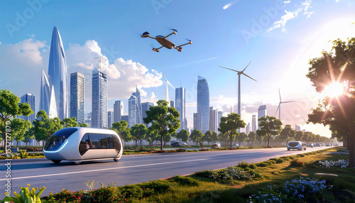 高層ビル、空飛ぶ車、クリーンエネルギーなど理想の未来都市・スマートシティの生成AI画像