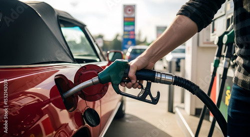 A woman's hand fills a car's tank with gasoline at a pump, day or night
