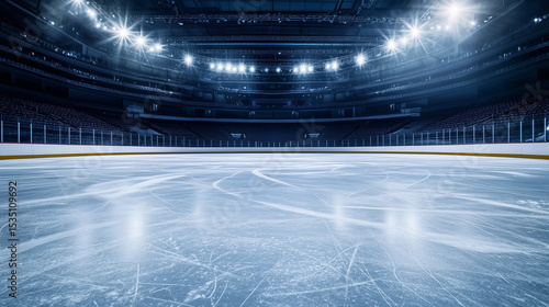Empty ice rink with a smooth surface, viewed from the stands, under soft lighting. A serene and minimalist sports moment.