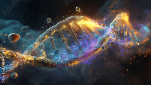 Glowing DNA strand forms a universal equation with floating life forms, symbolizing the unity of biological theory.