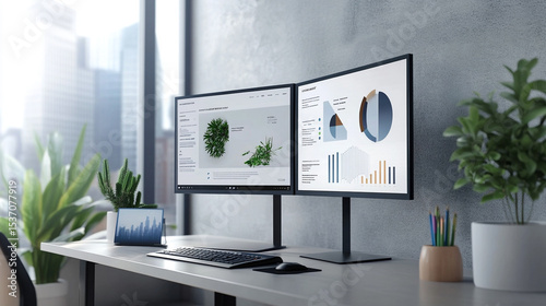 Modern Office Setup with Dual Monitors Displaying Custom Mockup and Data Visualizations Surrounded by Indoor Plants in a Bright Workspace