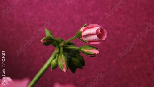 Kwiat pelargonii zwinięty w rulon, z widocznymi pąkami w fazie rozkwitania