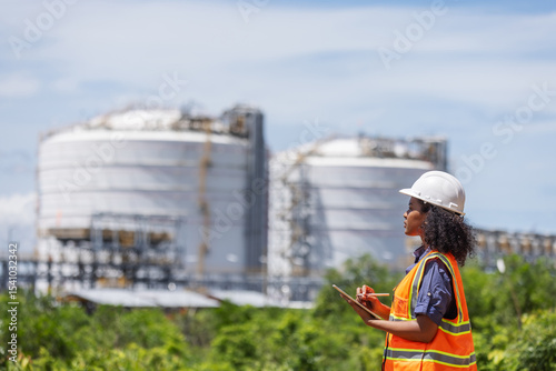 An environmental engineer conducts a site survey near large industrial storage tanks. Wearing safety gear and holding a tablet, she evaluates environmental impact and infrastructure integrity.