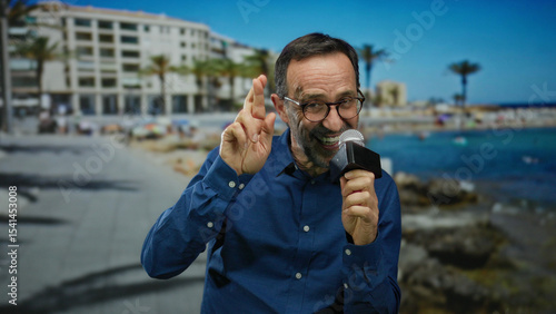 Middle-aged hispanic man in glasses speaking into microphone by seaside, vibrant beach background with sunny outdoor ambiance.