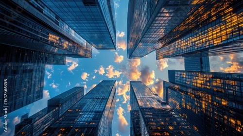 skyward gaze between towering skyscrapers reflecting the hues of sunrise on glass facades creating an impressive urban landscape showcasing architectural grandeur and modern cityscapes