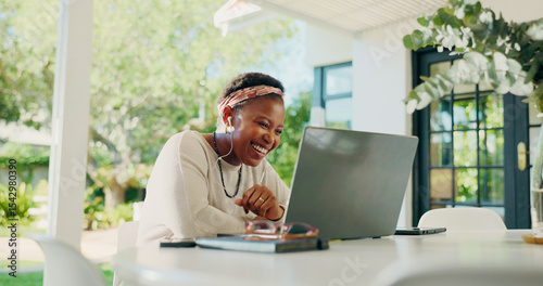 Video call, remote work and black woman on laptop in home for contact, online chat and virtual meeting. Communication, creative freelancer and earphones for discussion, talking and webinar on patio