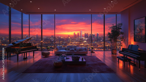 Luxury penthouse living room at sunset. Panoramic city view