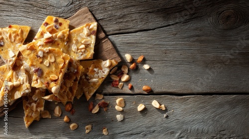 Crispy nut brittle with mixed nuts scattered on dark wooden surface for sweet snack or dessert