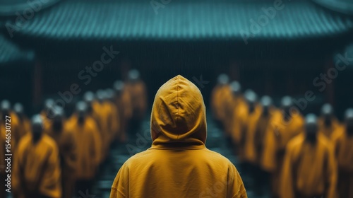 A solitary figure, cloaked in a yellow robe, stands before a gathering of monks, encapsulating themes of spirituality, unity, and meditation in a serene environment.