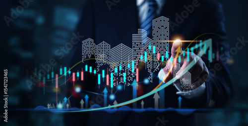 Businessman analyzing real estate investment data with futuristic city skyline and candlestick chart, property growth, market trends, and financial analytics.