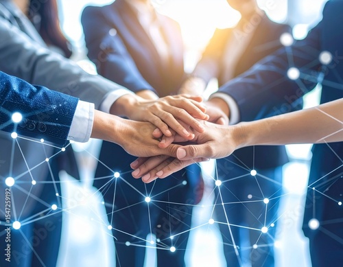 여러명의 겹쳐진 손과 연결된 네트워크를 상징하는 디지털 선과 점 Digital lines and dots symbolizing multiple overlapping hands and connected networks