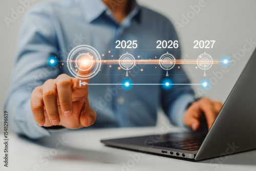 A person interacts with a digital timeline projected above a laptop, highlighting future years 2025, 2026 to 2027, symbolizing business planning and strategic foresight in technology.