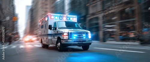 The ambulance rapidly responds to an emergency in a bustling city street.