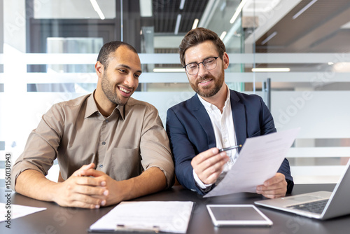 Two businessmen are reviewing documents in a modern office, discussing plans, and smiling. Collaboration and business are key themes.