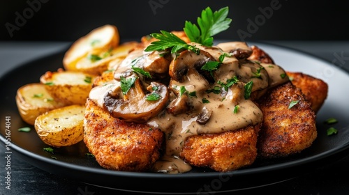 A delicious plate featuring crispy fried chicken fillets topped with a rich creamy mushroom sauce, accompanied by golden roasted potatoes garnished with fresh herbs.
