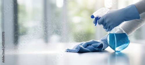 The cleaning process with disinfectant spray and microfiber cloth on a surface.