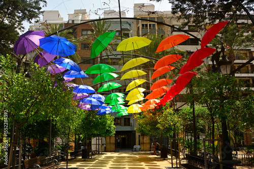 kolorowe parasole wiszące w mieście podczas parady równości, symbol LGBT, Colorful decorative umbrellas, rainbow umbrellas hanging around the city during the pride parade, lgbt umbrellas