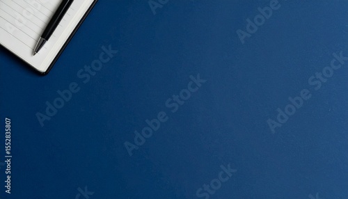 マットな深いネイビーブルー背景の左上にミニマルなノートとペンのセットが整然と積まれ、会議や計画、スタートアップの戦略を連想させるゆったりとした余白を持つデザイン