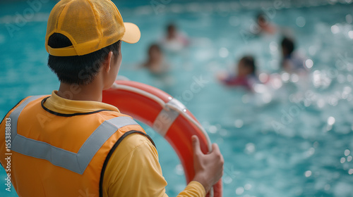 Lifeguard supervising children at a swimming pool with lifebuoy
