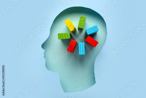 Colorful blocks visible through cut blue paper in shape of human head on turquoise background. Logic concept