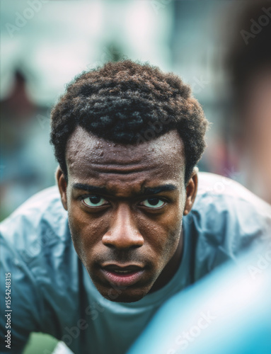 Close-up of a football player in mid-air, making a decisive kick towards the goal, showcasing intense focus and athleticism in a competitive sports moment. Dynamic action and determination