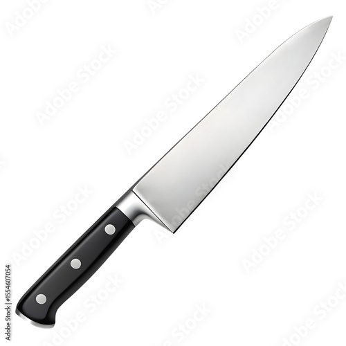 Professional chef knife with black handle and shiny steel blade isolated on transparent background