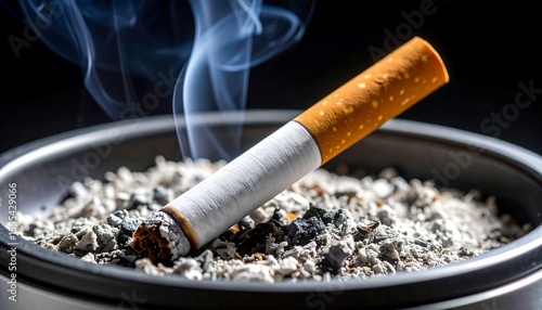 Burning cigarette in ashtray with smoke with closeup against black background.